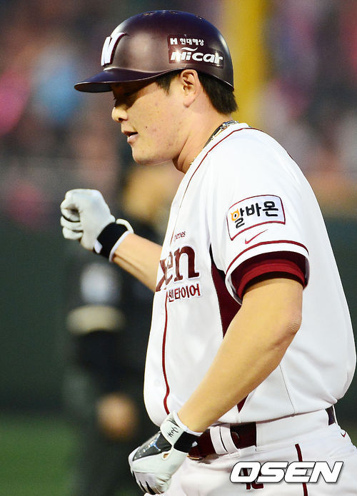 12일 오후 서울 목동구장에서 2013 한국야쿠르트 세븐프로야구 넥센 히어로즈와 SK 와이번스의 경기에서 6회말 1사 주자 1,2루 넥센 이성열이 우익수 앞 1타점 적시타를 날린 후 주먹을 쥐고 있다.