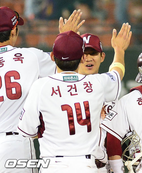 경기를 마치고 넥센 김민성이 서건창과 하이파이브를 하고 있다. / rumi@osen.co.kr