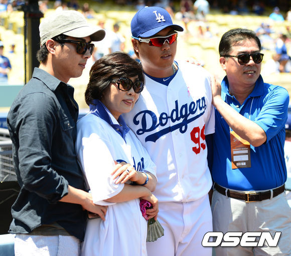 13일(이하 한국시간) 미국 캘리포니아 로스앤젤레스 다저스타디움에서 열리는 '2013 메이저리그' LA 다저스와 마이애미 말린스의 경기를 앞두고 다저스 류현진과 가족들이 미국 어머니의 날을 맞이해 그라운드에서 기념촬영을 하고 있다.
