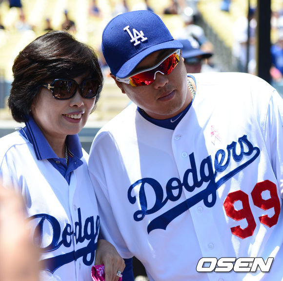 13일(이하 한국시간) 미국 캘리포니아 로스앤젤레스 다저스타디움에서 열리는 '2013 메이저리그' LA 다저스와 마이애미 말린스의 경기를 앞두고 미국 어머니의 날을 맞이해 어머니 박승순(54) 씨와 기념촬영을 하고 있다.