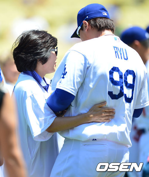 13일(이하 한국시간) 미국 캘리포니아 로스앤젤레스 다저스타디움에서 열리는 '2013 메이저리그' LA 다저스와 마이애미 말린스의 경기를 앞두고 다저스 류현진이 미국 어머니의 날을 맞이해 어머니 박승순(54) 씨와 시구행사를 마치고 포옹하고 있다.