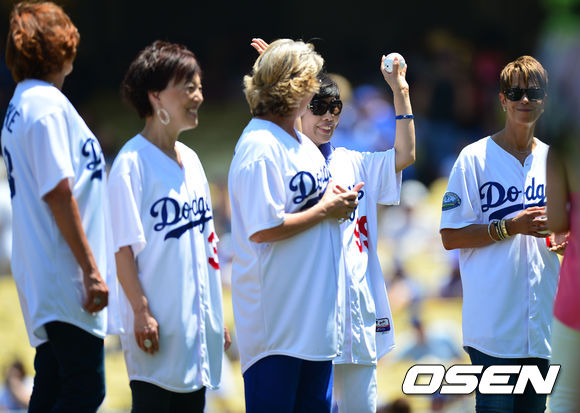 13일(이하 한국시간) 미국 캘리포니아 로스앤젤레스 다저스타디움에서 열리는 '2013 메이저리그' LA 다저스와 마이애미 말린스의 경기를 앞두고 다저스 류현진의 어머니 박승순(54) 씨가 시구행사를 앞두고 인사하고 있다.