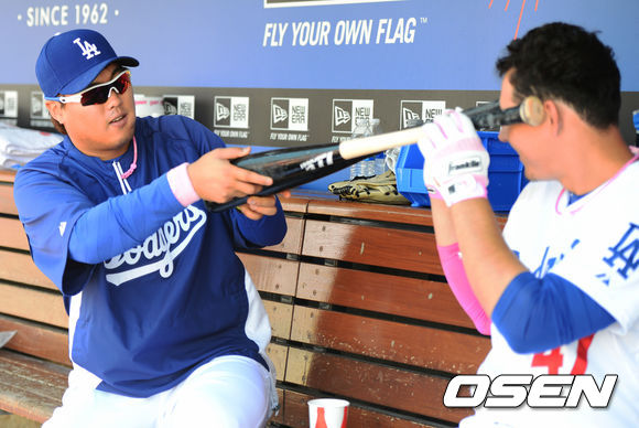 13일(이하 한국시간) 미국 캘리포니아 로스앤젤레스 다저스타디움에서 '2013 메이저리그' LA 다저스와 마이애미 말린스의 경기가 열렸다. 다저스 류현진이 루이스 크루스와 더그아웃에서 장난을 치고 있다.
