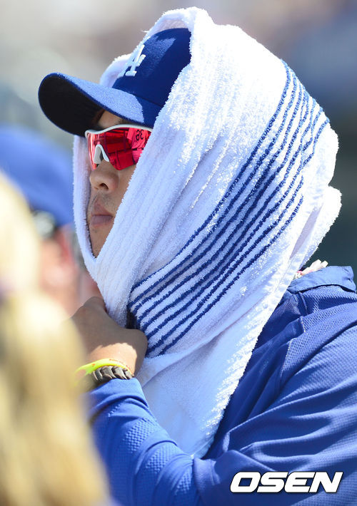 13일(이하 한국시간) 미국 캘리포니아 로스앤젤레스 다저스타디움에서 '2013 메이저리그' LA 다저스와 마이애미 말린스의 경기가 열렸다. 다저스 류현진이 따가운 햇살을 가리기 위해 수건을 얼굴에 두르고 경기를 지켜보고 있다.