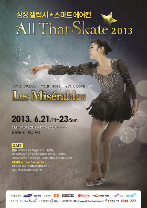 김연아의 매니지먼트사인 ㈜올댓스포츠(대표 박미희)는 오는 6월 21일부터 23일까지 3일간 서울 올림픽공원 체조경기장 특설 아이스링크에서 열리는 '삼성 갤럭시★스마트에어컨 올댓스케이트 2013'의 컨셉이 '레 미제라블-꿈꾸어라, 도전하라, 사랑하라'로 결정됐다고 밝혔다.