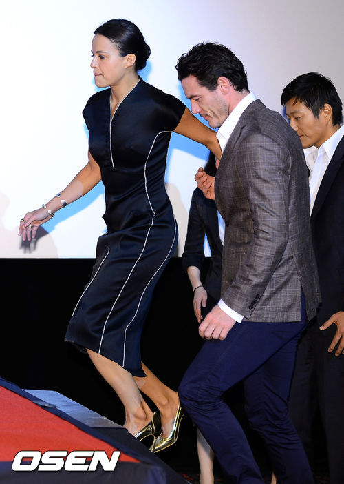 13일 오후 서울 용산CGV에서 진행된 영화 '분노의 질주: 더 맥시멈'(저스틴 린 감독) 언론배급시사회에서 미셀 로드리게즈가 루크 에반스를 잡으며 포토월로 입장하고 있다.