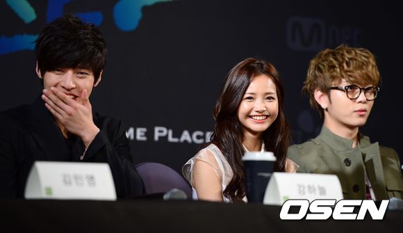 13일 오후 서울 여의도동 63시티 주니퍼룸에서 케이블채널 엠넷 음악드라마 ‘몬스타’ 제작발표회에서 배우 강하늘, 하연수, 비스트 용준형이 취재진의 질문에 환하게 웃고 있다.