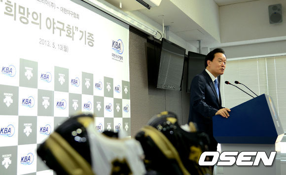 13일 오후 서울 도곡동 야구회관(KBO)에서 진행된 '대한야구협회-데상트코리아 희망의 야구화 기증식'에서 대한야구협회 이병석 회장이 인사말을 하고 있다.