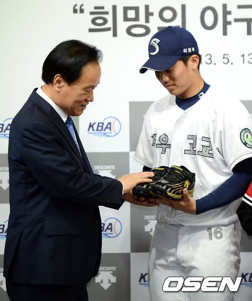 13일 오후 서울 도곡동 야구회관(KBO)에서 진행된 '대한야구협회-데상트코리아 희망의 야구화 기증식'에서 대한야구협회 이병석 회장이 의정부 상우고 야구부 선수에게 야구화를 건네며 이야기를 하고 있다.