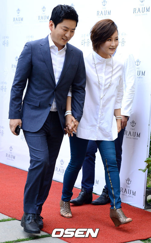 결혼식장을 찾은 강레오 박선주 부부가 포토월을 빠져나가고 있다.