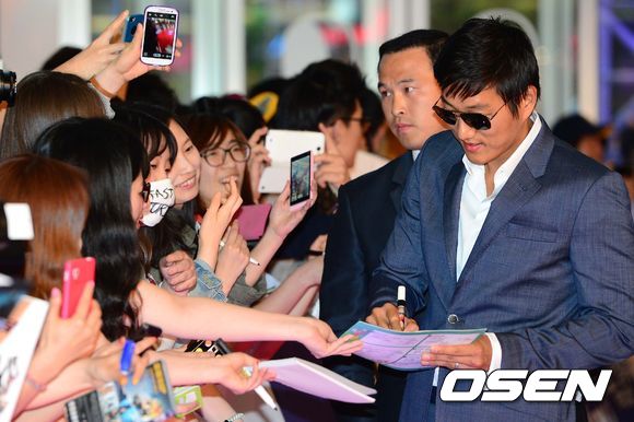 13일 오후 서울 영등포 타임스퀘어에서 진행된 영화 '분노의 질주: 더 맥시멈'(저스틴 린 감독) 레드카펫 행사에서 배우 성강이 팬들에게 사인을 해주고 있다.