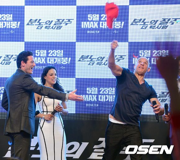 13일 오후 서울 영등포 타임스퀘어에서 진행된 영화 '분노의 질주: 더 맥시멈'(저스틴 린 감독) 레드카펫 행사에서 배우 빈 디젤이 팬들에게 모자를 던져주고 있다.