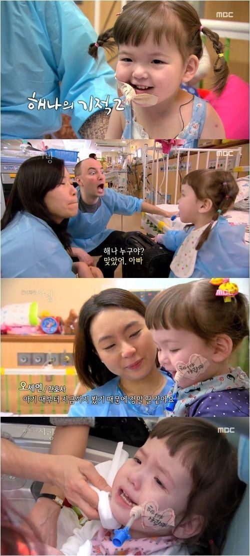 이날 방송된 '휴먼다큐 사랑'은 지난 방송에 이어 선천성 기도 무형성증을 앓고 있는 아이 해나 이야기의 2부가 전파를 탔다. 선천적으로 기도가 없는 해나는 식도에 튜브를 꽂아 호흡하는 32개월 된 여자 아이. 보통 태어나자마자 목숨을 잃는 기도 무형성증 아이와 다르게 해나는 주변 사람들의 보살핌으로 기적처럼 살아가고 있었다. 그러던 중 미국에서 해나에게 이식수술을 해 주겠다는 의사가 나타났고, 이날 방송에서 해나는 미국으로 건너가 인공기도 이식수술을 성공적으로 마쳤다.