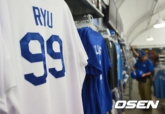14일(이하 한국시간) 미국 캘리포니아 로스앤젤레스 다저스타디움에서 '2013 메이저리그' LA 다저스와 워싱턴 내셔널스의 경기가 열릴 예정인 가운데 류현진의 백넘버가 적힌 유니폼이 다저스 팬샵에 진열되어 있다.