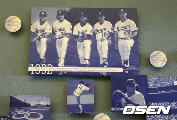 14일(이하 한국시간) 미국 캘리포니아 로스앤젤레스 다저스타디움에서 '2013 메이저리그' LA 다저스와 워싱턴 내셔널스의 경기가 열릴 예정인 가운데 5년 연속(92-96) 신인왕을 수상한 선수들의 사진이 전시되어 있다.