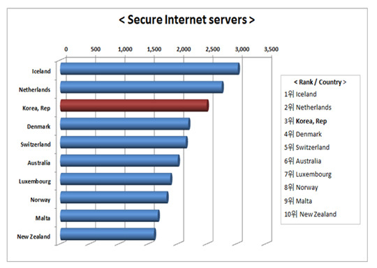 미래창조과학부(이하 ‘미래부’)와 개인정보보호협회는 세계경제포럼(WEF)에서 발표한 ‘2013년 세계 ICT 보고서(Global Information Technology Report 2010-2011)’ 에서 우리나라의 보안서버 보급률이 세계 143개국 중 3위(‘11년 보급 기준)를 달성했다고 밝혔다.