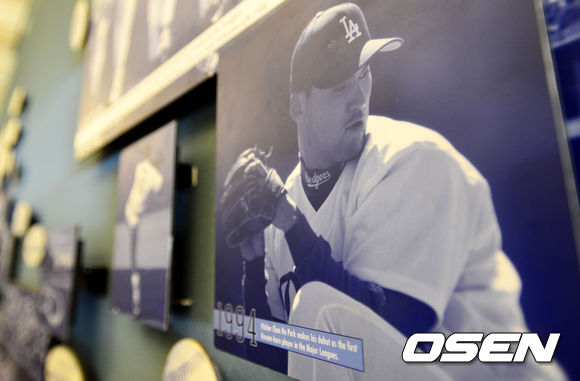 14일(이하 한국시간) 미국 캘리포니아 로스앤젤레스 다저스타디움에서 '2013 메이저리그' LA 다저스와 워싱턴 내셔널스의 경기가 열릴 예정인 가운데 1994년 한국에서 태어난 선수 최초로 메이저리그에 입성한 박찬호의 사진이 전시되어 있다.