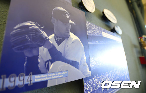 14일(이하 한국시간) 미국 캘리포니아 로스앤젤레스 다저스타디움에서 '2013 메이저리그' LA 다저스와 워싱턴 내셔널스의 경기가 열릴 예정인 가운데 1994년 한국에서 태어난 선수 최초로 메이저리그에 입성한 박찬호의 사진이 전시되어 있다.