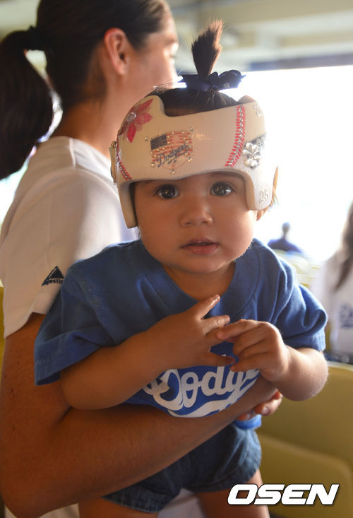 14일(이하 한국시간) 미국 캘리포니아 로스앤젤레스 다저스타디움에서 '2013 메이저리그' LA 다저스와 워싱턴 내셔널스의 경기가 열렸다. 다저스 유니폼과 헬멧을 쓴 아기 야구팬이 엄마 품에 안겨 있다.