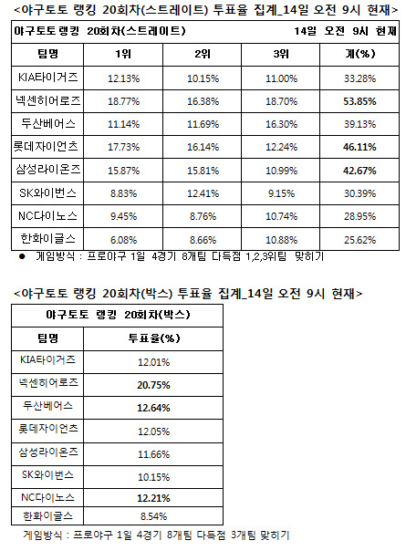 국민체육진흥공단(www.kspo.or.kr)이 발행하는 체육진흥투표권 수탁사업자인 스포츠토토 공식발매사이트인 베트맨(www.betman.co.kr)은 15일 개최되는 두산-삼성, 넥센-한화, KIA-SK, 롯데-NC 등 4경기 8개팀을 대상으로 한 야구토토 랭킹 20회차 스트레이트 게임 중간집계결과 넥센(53.85%), 롯데(46.11%), 삼성(42.67%)을 차례로 다득점 상위 3개팀으로 꼽았다고 밝혔다. 반면 NC(28.95%), 한화(25.62%)는 가장 적은 득점을 기록할 것으로 예상했다.