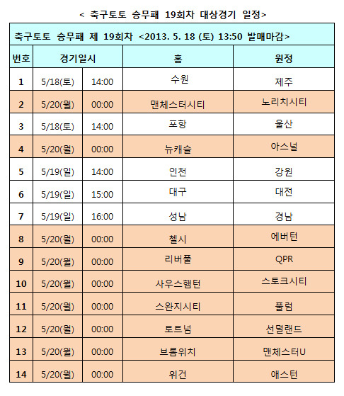 축구토토 승무패 19회차 게임은 오는 18일 오후 1시 50분에 발매가 마감된다.