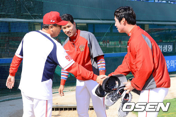 14일 오후 광주 무등구장에서 열린 '2013 한국야쿠르트 세븐 프로야구' KIA 타이거즈와 SK 와이번스의 경기전, SK 김상현이 KIA 선동렬 감독과 악수를 나누고 있다