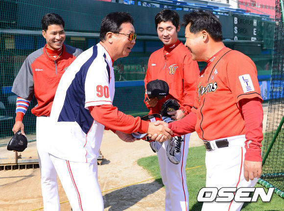 14일 오후 광주 무등구장에서 열린 '2013 한국야쿠르트 세븐 프로야구' KIA 타이거즈와 SK 와이번스의 경기전, SK 이만수 감독이 KIA 선동렬 감독과 이야기를 나누고 있다