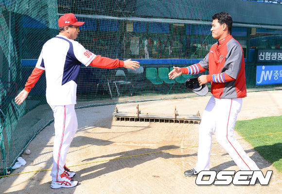 14일 오후 광주 무등구장에서 열린 '2013 한국야쿠르트 세븐 프로야구' KIA 타이거즈와 SK 와이번스의 경기전, SK 김상현이 KIA 선동렬 감독에게 인사를 하고 있다