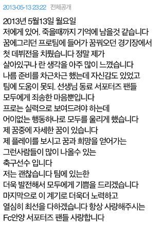 그는 자신의 미니홈피에 글을 남겼다 "저에게 있어 (자책골은)죽을 때까지 기억에 남을 것 같습니다"며 책망했고 "꿈에 그리던 프로팀에 들어와 꿈꿔오던 경기장에서 첫 데뷔전을 치렀습니다. 선생님, 동료, 서포터즈 팬들 모두에게 죄송한 마음뿐입니다"며 미안한 마음을 전했다.