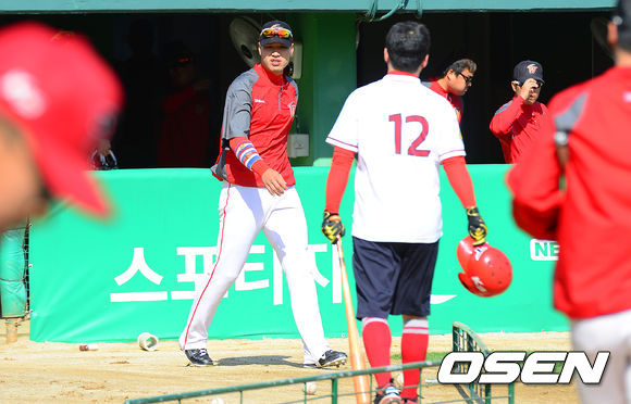 14일 오후 광주 무등구장에서 열린 '2013 한국야쿠르트 세븐 프로야구' KIA 타이거즈와 SK 와이번스의 경기전, SK 김상현이 무등구장 그라운드에 들어서고 있다