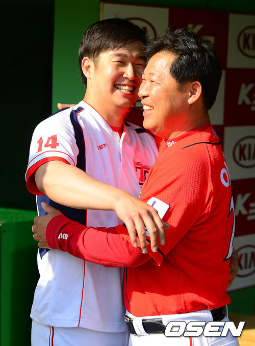 14일 오후 광주 무등구장에서 열린 '2013 한국야쿠르트 세븐 프로야구' KIA 타이거즈와 SK 와이번스의 경기전, SK 이만수 감독과 KIA 송은범이 포옹을 하고 있다
