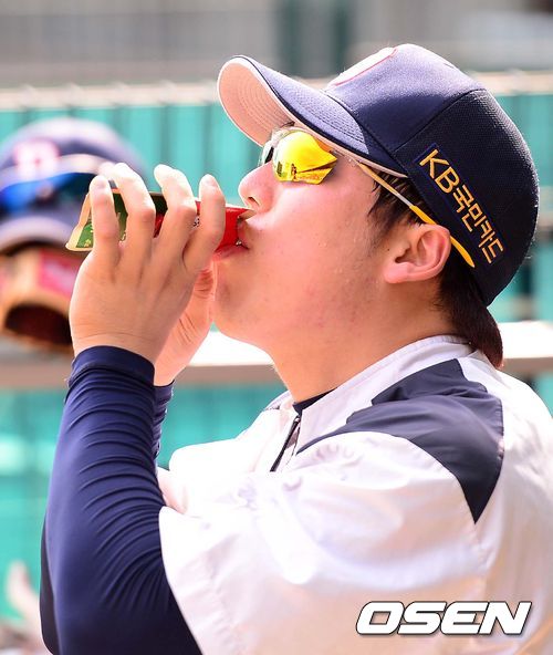 14일 오후 서울 잠실야구장에서 열린 2013 한국야쿠르트 세븐프로야구 두산 베어스와 삼성 라이온즈의 경기, 경기에 앞서 두산 김현수가 덕아웃에서 건강 음료를 마시고 있다.