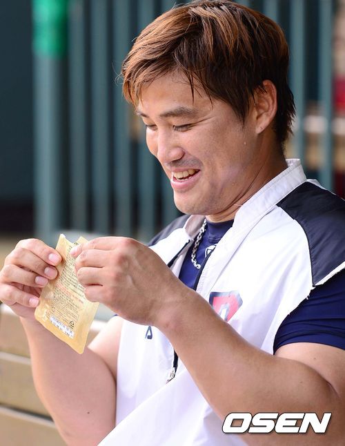 14일 오후 서울 잠실야구장에서 열린 2013 한국야쿠르트 세븐프로야구 두산 베어스와 삼성 라이온즈의 경기, 경기에 앞서 두산 홍성흔이 덕아웃에서 건강 음료를 마시고 있다.