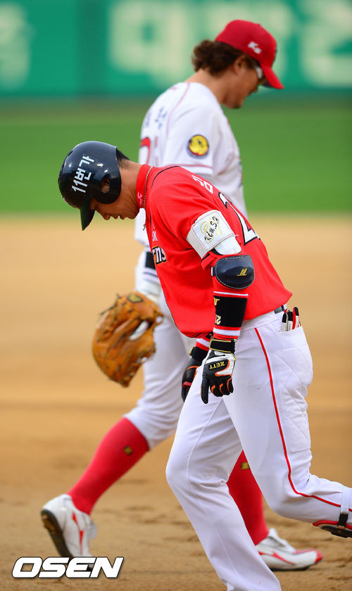 14일 오후 광주 무등구장에서 열린 '2013 한국야쿠르트 세븐 프로야구' KIA 타이거즈와 SK 와이번스의 경기, 1회초 1사 1,2루 SK 김상현이 진루타를 날린 후 더그아웃으로 들어가고 있다