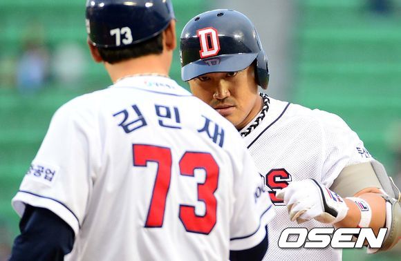 14일 오후 서울 잠실야구장에서 열린 2013 한국야쿠르트 세븐프로야구 두산 베어스와 삼성 라이온즈의 경기, 1회말 2사 1루 두산 홍성흔이 좌전 안타를 치고 김민재 코치와 하이파이브를 하고 있다.