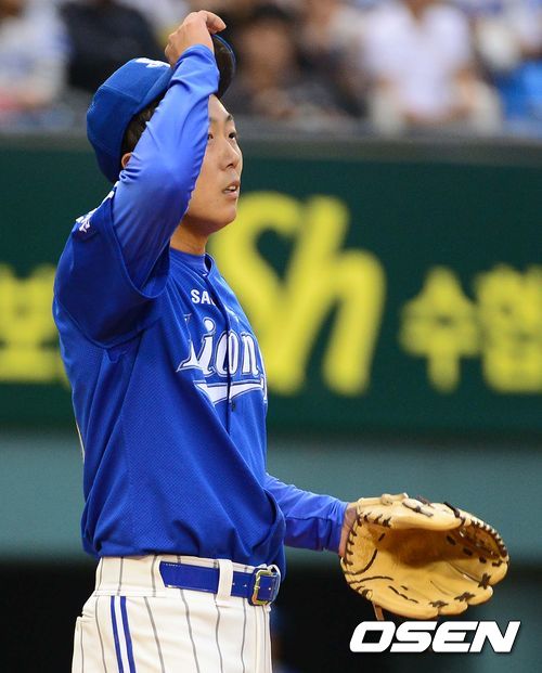 14일 오후 서울 잠실야구장에서 열린 2013 한국야쿠르트 세븐프로야구 두산 베어스와 삼성 라이온즈의 경기, 1회말 2사 1,2루에서 삼성 배영수가 두산 오재원에게 내야 안타를 허용하고 아쉬운 표정을 짓고 있다.