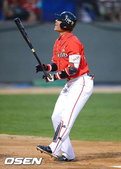 14일 오후 광주 무등구장에서 열린 '2013 한국야쿠르트 세븐 프로야구' KIA 타이거즈와 SK 와이번스의 경기, 4회초 SK 선두타자 김상현이 헛스윙후 아쉬워하고 있다