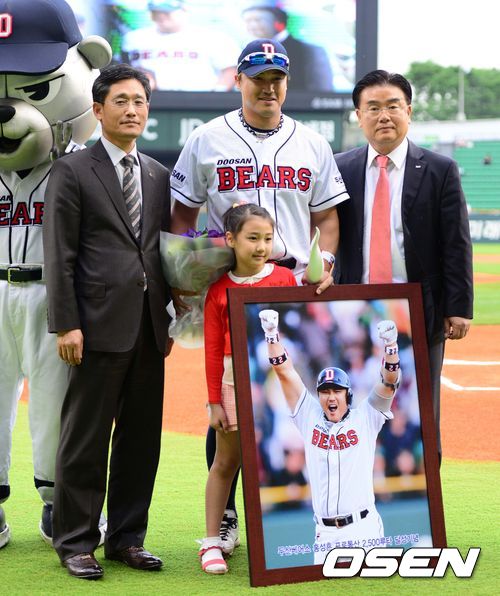 14일 오후 서울 잠실야구장에서 열린 2013 한국야쿠르트 세븐프로야구 두산 베어스와 삼성 라이온즈의 경기, 경기에 앞서 두산 홍성흔이 프로통산 2,500루타 시상식을 마치고 양해영 한국야구위원회 사무총장, 딸 홍화리, 김태룡 두산 베어스 단장과 기념촬영을 하고 있다.