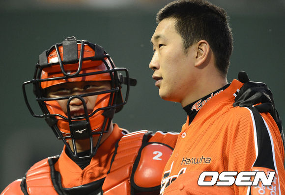 14일 오후 서울 목동구장에서 열린 '2013 한국야쿠르트 세븐프로야구' 넥센 히어로즈와 한화 이글스의 경기, 3회말 수비 종료 후 한화 김혁민과 박노민이 더그아웃으로 들어오면서 이야기를 나누고 있다.