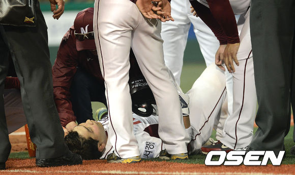 14일 오후 서울 목동구장에서 열린 '2013 한국야쿠르트 세븐프로야구' 넥센 히어로즈와 한화 이글스의 경기, 5회말 무사 넥센 허도환이 기습번트를 시도하다 배트로 자신의 얼굴을 때린 뒤 고통스러워하고 있다.
