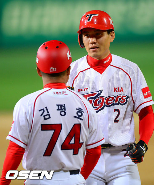 14일 오후 광주 무등구장에서 열린 '2013 한국야쿠르트 세븐 프로야구' KIA 타이거즈와 SK 와이번스의 경기,5회말 2사 만루 KIA 신종길이 2타점 적시타를 날린 후 김평호 코치와 하이파이브를 하고 있다