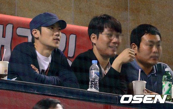 14일 오후 서울 잠실야구장에서 열린 2013 한국야쿠르트 세븐프로야구 두산 베어스와 삼성 라이온즈의 경기, 배우 김강우가 관중석에서 경기를 바라보고 있다.