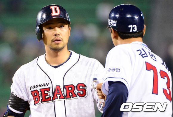 14일 오후 서울 잠실야구장에서 열린 2013 한국야쿠르트 세븐프로야구 두산 베어스와 삼성 라이온즈의 경기, 5회말 2사 1,3루에서 두산 오재원이 중전 적시타를 치고 김민재 코치와 하이파이브를 하고 있다.