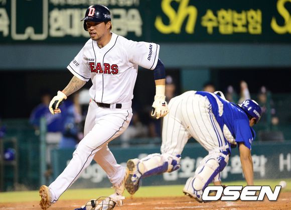 14일 오후 서울 잠실야구장에서 열린 2013 한국야쿠르트 세븐프로야구 두산 베어스와 삼성 라이온즈의 경기, 7회말 2사 1,3루에서 두산의 이중도루 작전 때 3루주자 오재원이 홈을 밟고 있다.