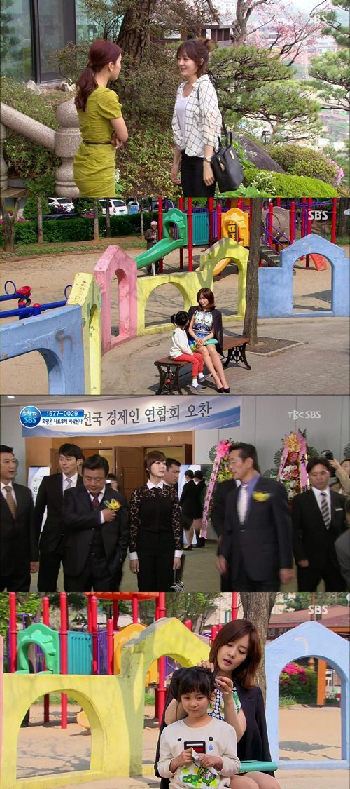 성유리는 엄마 역할이지만 커리어우먼 캐릭터에 맞게 컬러풀한 원피스에 블랙 재킷과 민트색 클러치 백을 코디해 감각적인 스타일을 연출했다. 회의에 참석한 장면에서는 블랙과 화이트 컬러의 배색 레이스 블라우스와 같은 패턴의 가방을 매치해 세련된 스타일을 완성시켰다.