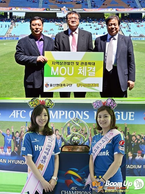 울산 현대가 지난 11일 수원과 홈경기에서 울산 중구상인연합회와 업무협약(MOU)을 체결하고 전통시장 활성화를 위해 적극 나섰다.