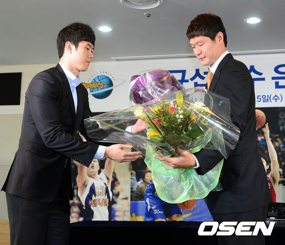 이규섭이 15일 오전 서울 논현동 KBL센터에서 은퇴 기자회견에서 임동섭으로부터 꽃다발을 받고 있다.