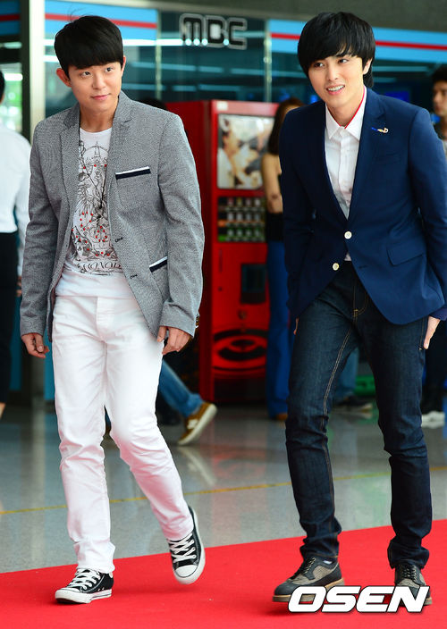 15일 오후 일산 MBC 드림센터 1층 다목적 세미나홀 앞에서 열린 MBC 새 예능 '파이널 어드벤처' 제작발표회의 포토월 행사에서 토니안과 정희철이 무대 앞으로 걸어나오고 있다.