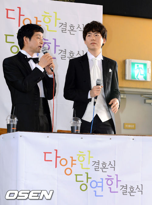 영화 제작자 겸 감독인 김조광수가 15일 오후 서울 동작구 아트나인 야외무대에서 동성연인과 결혼식 기자회견을 가졌다.