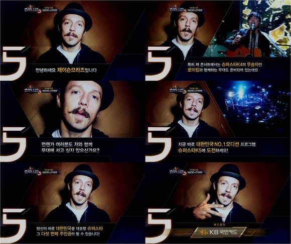 제이슨 므라즈는 30초가량의 영상에서 '나와 함께 무대에 서고 싶다면 대한민국 No.1 오디션 '슈퍼스타K5'에 도전하라'는 짧고 강한 메시지로 참가자들의 지원을 독려하고 있다. “당신이 바로 대한민국을 대표할 슈퍼스타 그 다섯 번째 주인공이 될 수 있습니다”라는 멘트와 '슈퍼스타K' 고유의 ‘K’ 손동작까지 선보이며 누리꾼들의 이목을 사로잡고 있다.